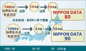 | NIPPON DATA80: 第3次循環器疾患基礎調査(1980年)に登録された30歳以上の男女 NIPPON DATA90: 第4次循環器疾患基礎調査(1990年)に登録された30歳以上の男女 |