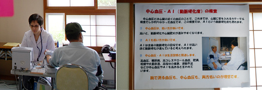 毎年行われる健診の際には,大阪府立健康科学センター,大阪大学,筑波大学,愛媛大学のスタッフによる“健診チーム”が井川町に駆けつける。2011年の井川町の健診は,6月15日(水)から23日(木)にかけて,井川町農村環境改善センターで行われた。ここでは6月18日(土)の健診のようすを,主要な検査項目を中心に,受診者と同じように会場をまわりながら写真とともに紹介する。